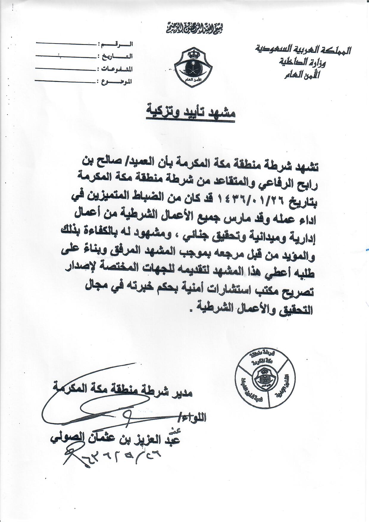 مشهد تأييد وتزكية من شرطة منطقة مكة المكرمة مجموعة الرفاعي للاستشارات
